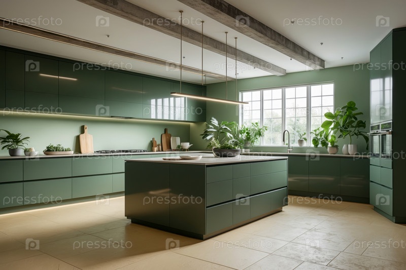 Современный стильный модный кухонный интерьер зеленый цвет мебель и бытовые принадлежности AI Generative