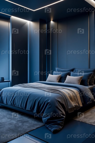 ИИ генеративный современный уютный интерьер спальня квартирная комната синий цвет, комфортный дизайн дома