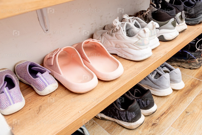 Хранение хранения обуви в коридоре, пары разных туфель на полке