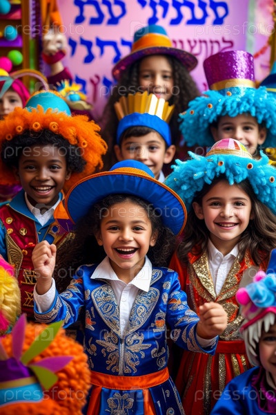 ИИ генеративные еврейские дети в карнавальных костюмах, празднующие традиционный еврейский праздник Пурим в Израиле