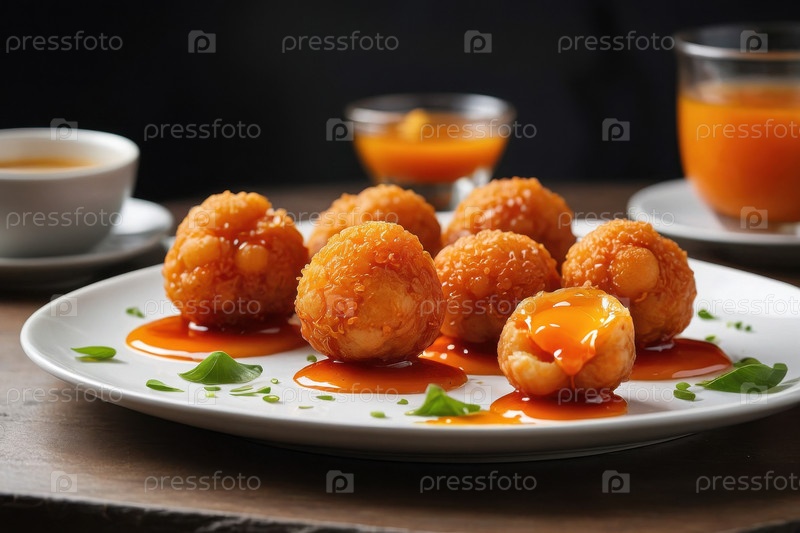 Филиппинская уличная закуска Kwek Kwek, куриное яйцо в тесто с хрустящей корой и пряным соусом AI Generative