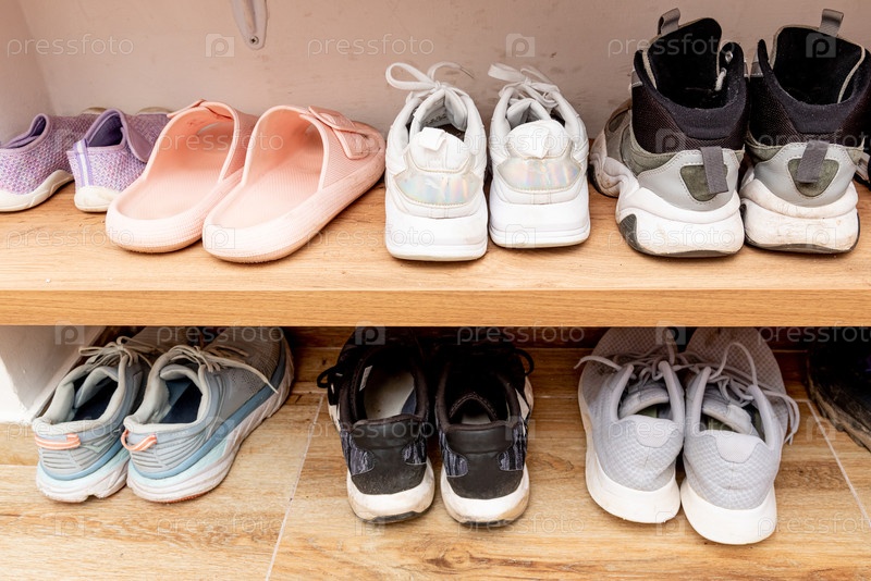 Хранение, хранение обуви в коридоре, пары различных туфель на полке в прихожей