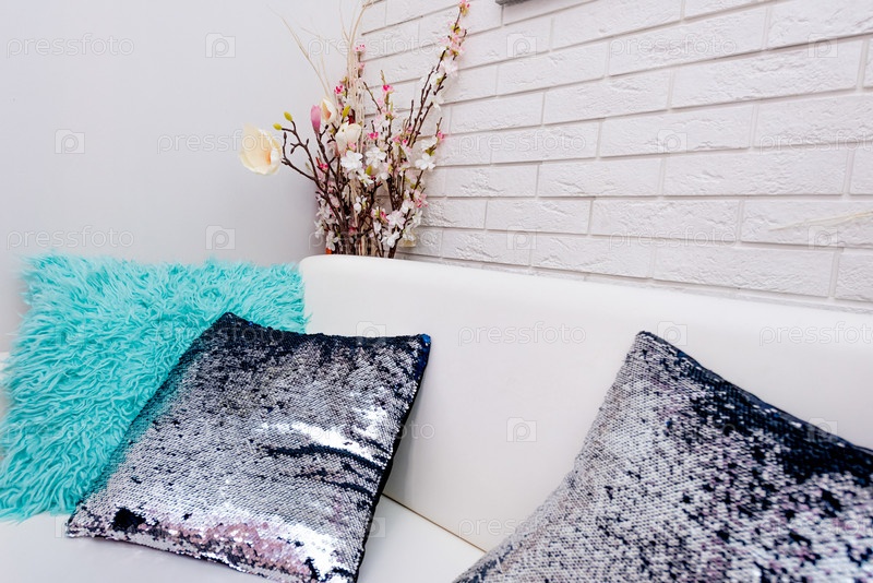 Цветные мягкие подушки на диване, уютный интерьер гостиничной квартиры жилая комната