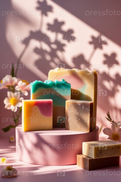 AI Generative Bar piece natural organic aromatic cosmetic handmade soap на стенде на розовом фоне
