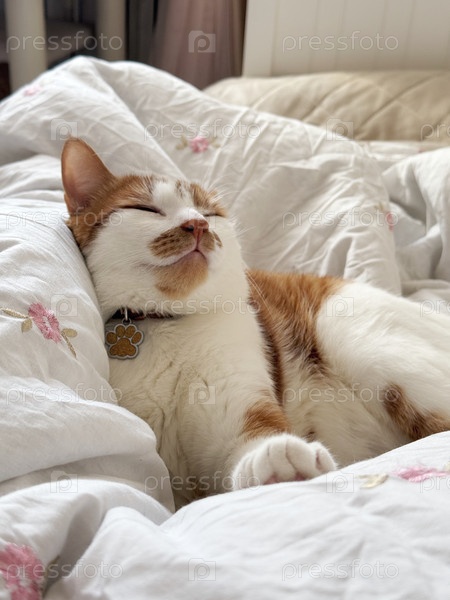 Домашняя рыжевато-белая кошка спит на кровати с головой откинутой назад