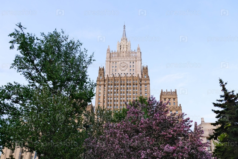 Здание Министерства иностранных дел России в цветах розовой яблони