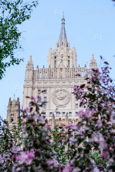 Здание Министерства иностранных дел России в цветах розовой яблони