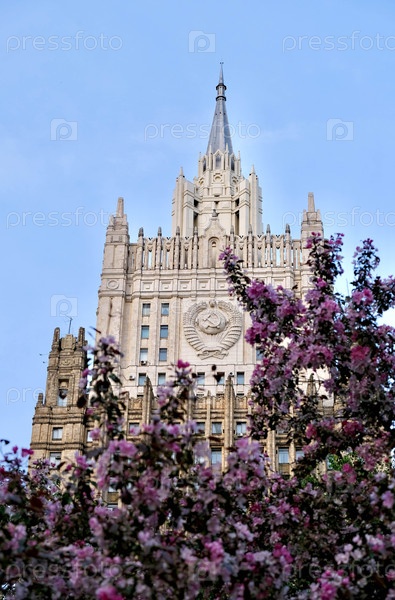 Здание Министерства иностранных дел России в цветах розовой яблони