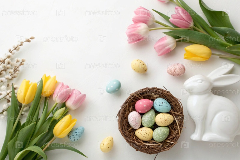 Пастельные пасхальные яйца, тюльпаны и милое украшение кролика на светлом фоне, весенние праздники плоская композиция. g
