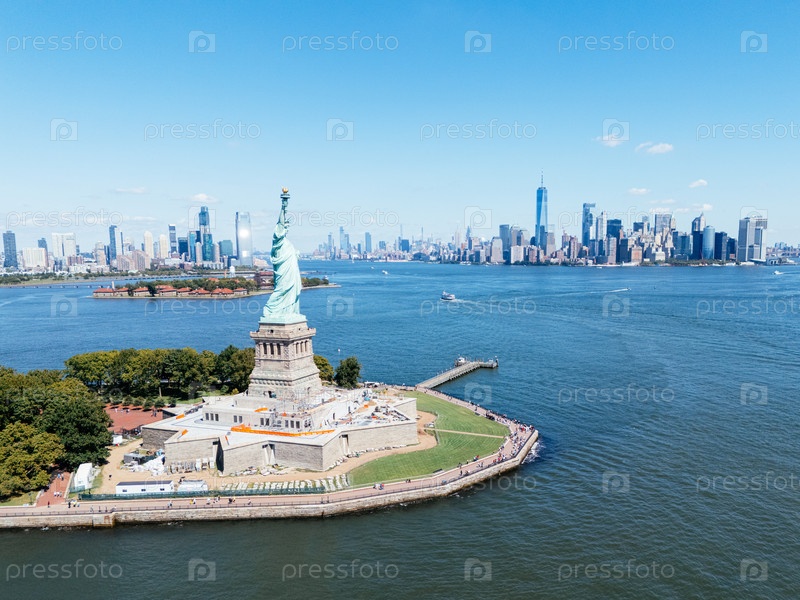 Вид с беспилотника на Статую Свободы на острове Свободы с горизонтом Манхэттена и Нью-Йоркской гавани, NYC США. g