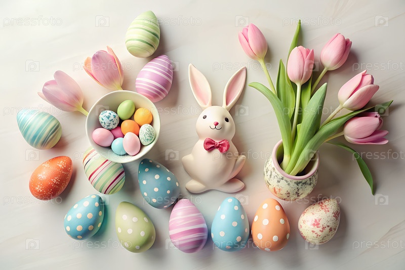 Пастельные пасхальные яйца, тюльпаны и милое украшение кролика на светлом фоне, весенние праздники плоская композиция. g