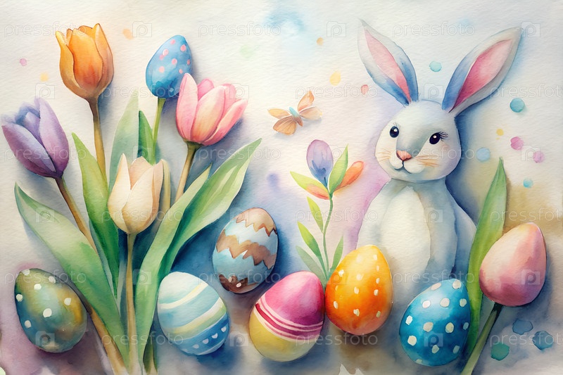 Пастельные пасхальные яйца, тюльпаны и милое украшение кролика на светлом фоне, весенние праздники плоская композиция. g