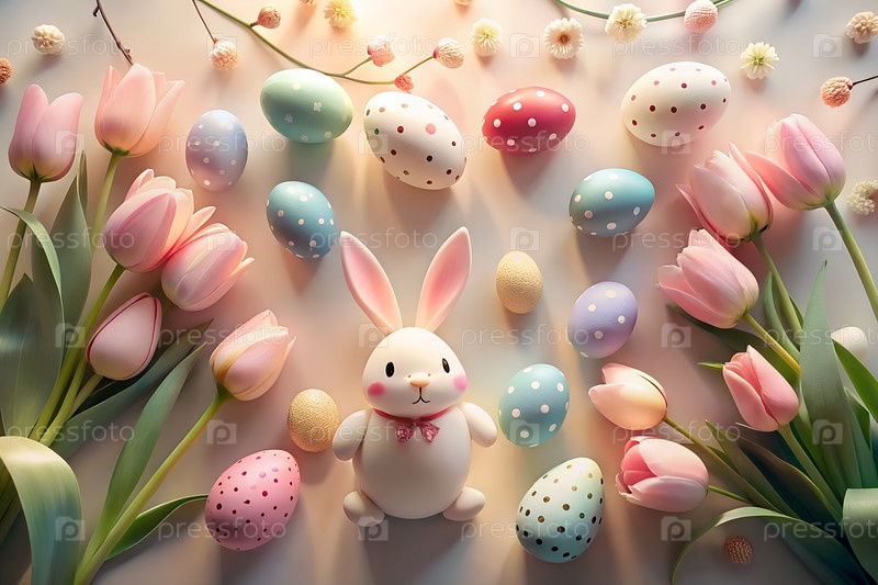 Пастельные пасхальные яйца, тюльпаны и милое украшение кролика на светлом фоне, весенние праздники плоская композиция. g