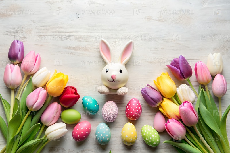 Пастельные пасхальные яйца, тюльпаны и милое украшение кролика на светлом фоне, весенние праздники плоская композиция. g