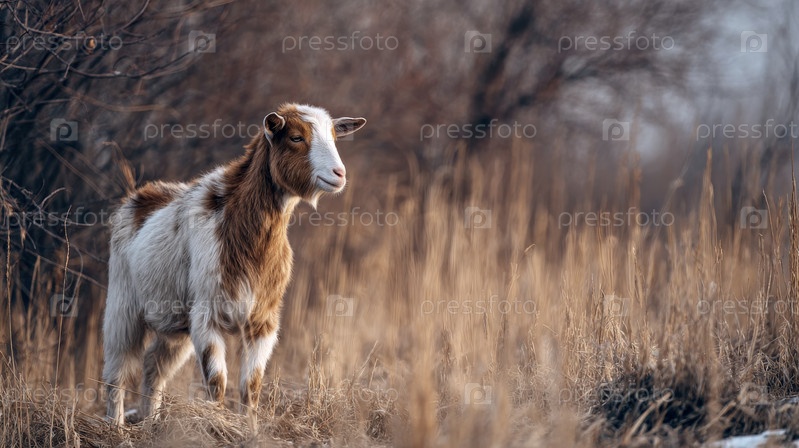 Коза стоит на сухом поле при закате солнца