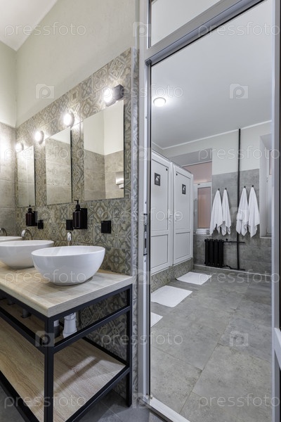 Широкоугольный интерьерный снимок чистой, современной общей ванной комнаты в хостеле с несколькими белыми раковинами для сосудов на деревянном ваните и видом через открытую дверь в общую зону с частным душем и туалетными кабинками