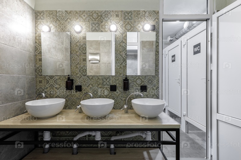 Современный интерьер общественного туалета с тремя белыми раковинами для сосудов на деревянной столешнице, декоративными орнаментированными стеклянными плитками, большими зеркалами с яркими лампами и белыми дверями унитаза на заднем плане