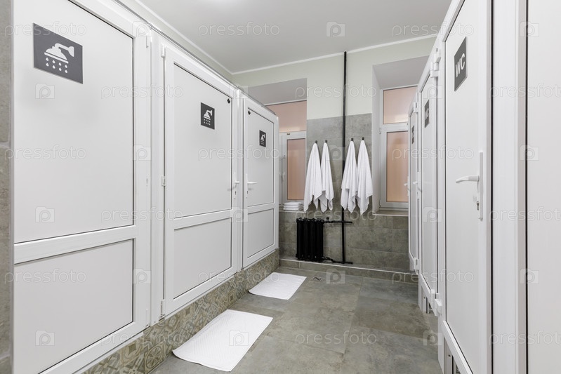 Общая ванная комната хостела с белым душем и современными туалетами