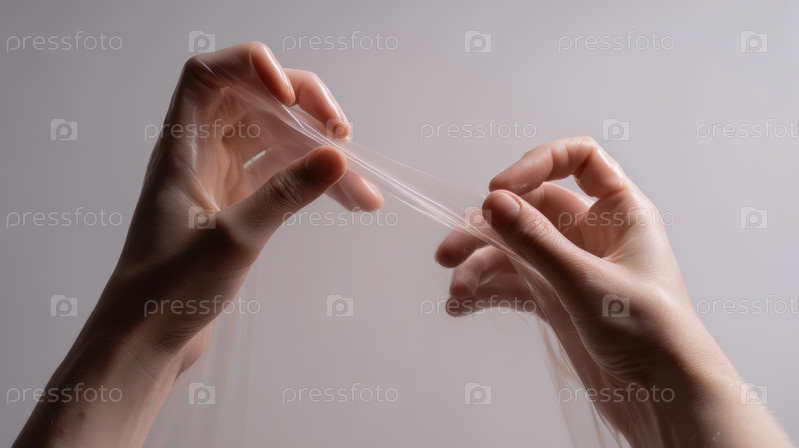 Руки растягивают прозрачный слизистый материал в студийном свете, тактильная сенсорная текстура показывает эластичность и гибкий полимерный материал