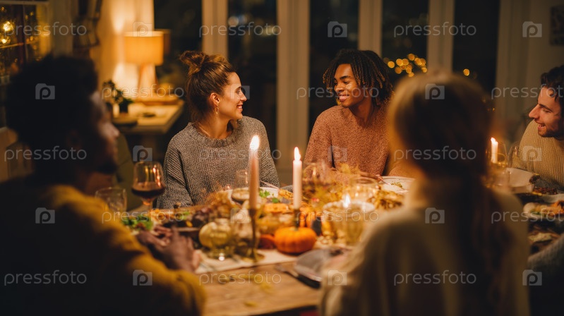 Друзья ужинают за столом при свечах в уютном доме, теплые вечера собираются вместе с едой, вином и разговором, захватывая дружбу, празднование и расслабленный образ жизни
