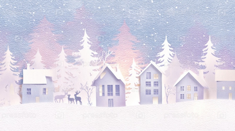 Зимняя деревенская иллюстрация на бумаге со снежными домами, соснами и оленями под пастельным небом, праздничный рождественский ландшафтный фон