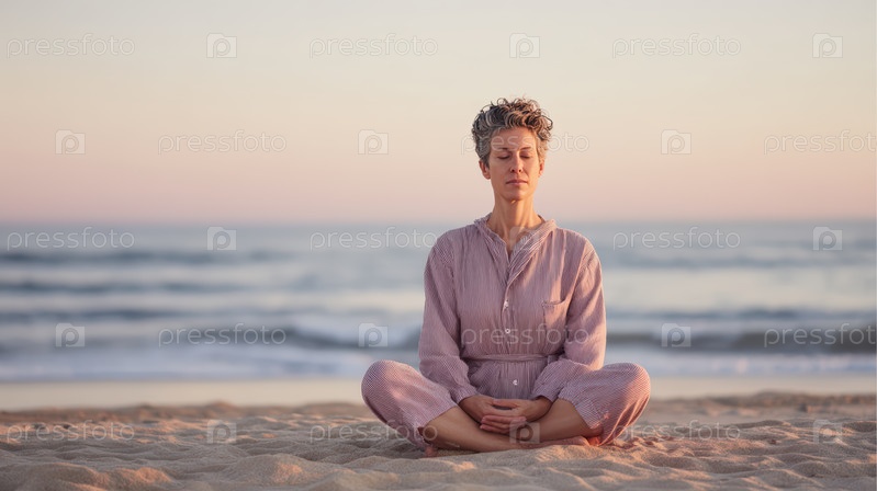 Женщина медитирует с перекрещенными ногами на песчаном пляже при восходе солнца, мирная оздоровительная сцена, представляющая осознанность, практику йоги, умственный баланс и здоровый образ жизни у океана