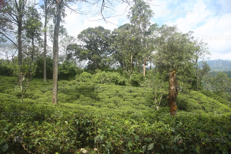 Пейзаж с видом на деревья, зеленые растения и синее небо