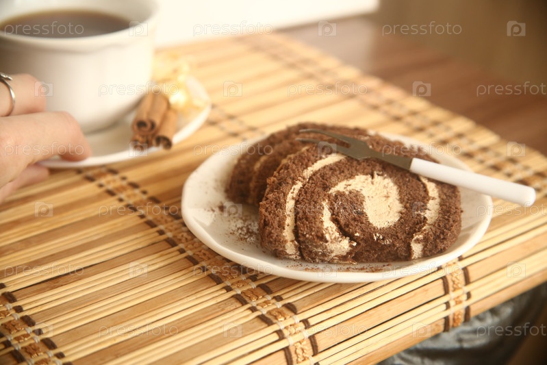 Шоколадный рулет с кофе и корицей на столе, вид сверху