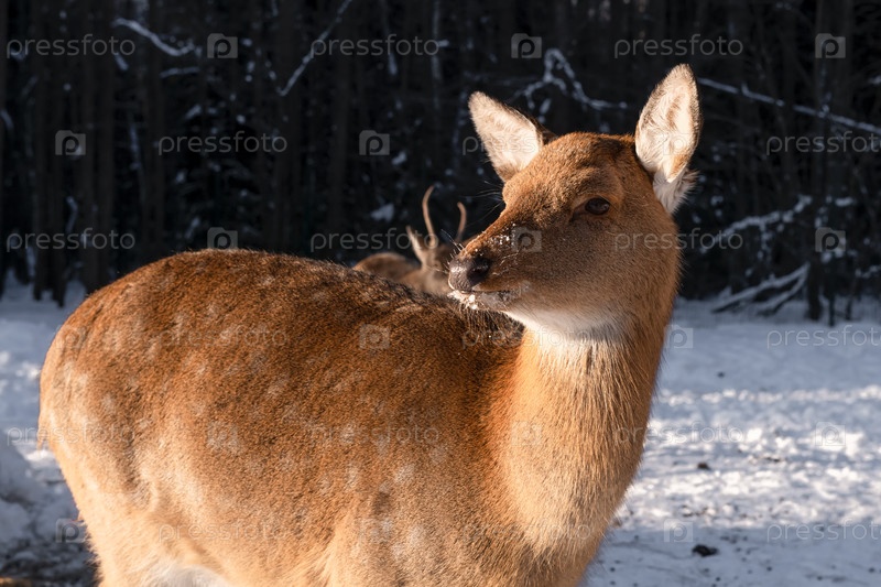 Самка пятнистого оленя в морозный зимний день