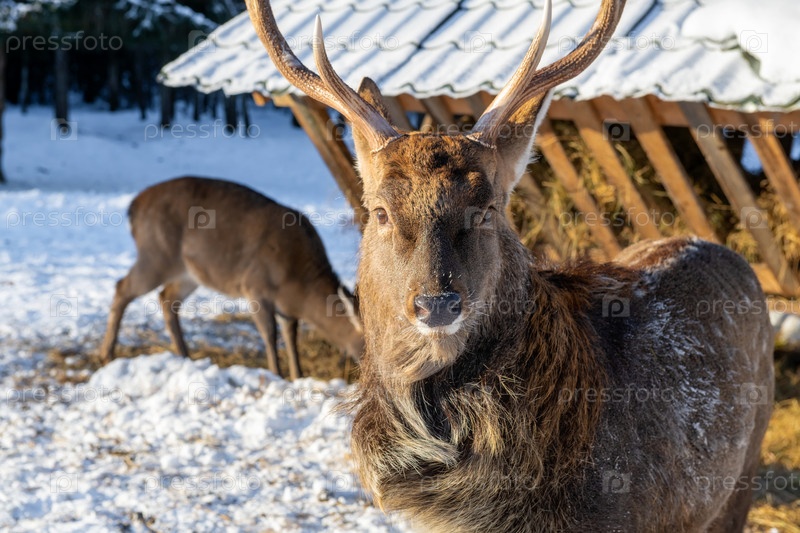 Портрет самца пятнистого оленя в морозный зимний день около кормушки в лесу