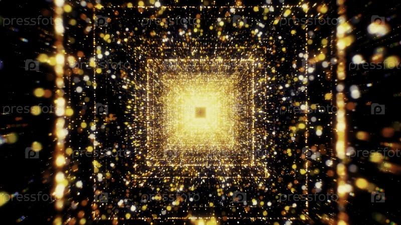 Абстрактный космический рисунок с бесконечными летающими прямоугольниками.Движение.Золотые успокаивающие размытые частицы в космосе