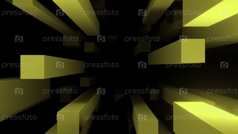 Абстрактные 3D желтые полосы, летящие далеко в расстоянии на черном фоне, бесшовная петля. дизайн. прямоугольные линии