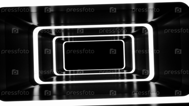 Абстрактный черно-белый футуристический тоннель с сияющими световыми линиями, ведущими в бесконечность