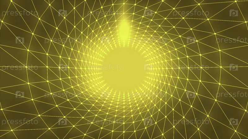 Абстрактный золотой фон с белыми соединенными точками и линиями, создающими эффект туннеля. Движение. Технологический круглый коридор