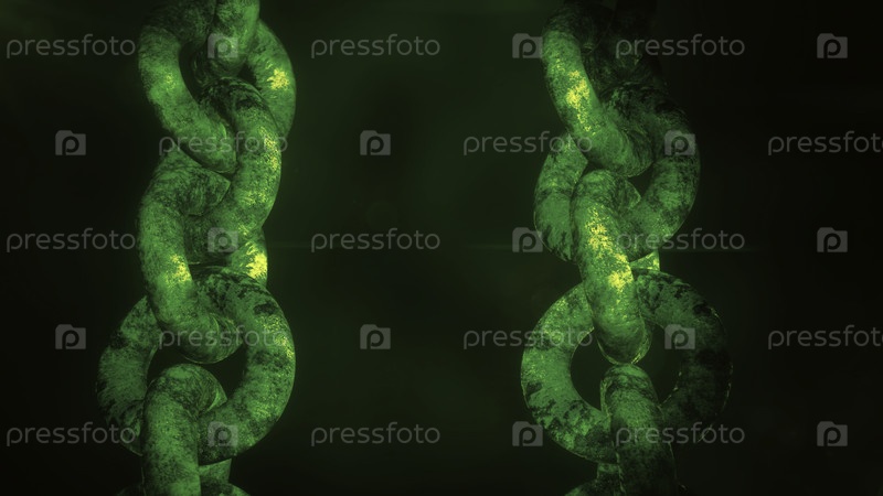 Зеленый фон. движение. длинная железная цепь с большими кольцами, освещенными темными цветами в анимации. высокое качество 4k кадры