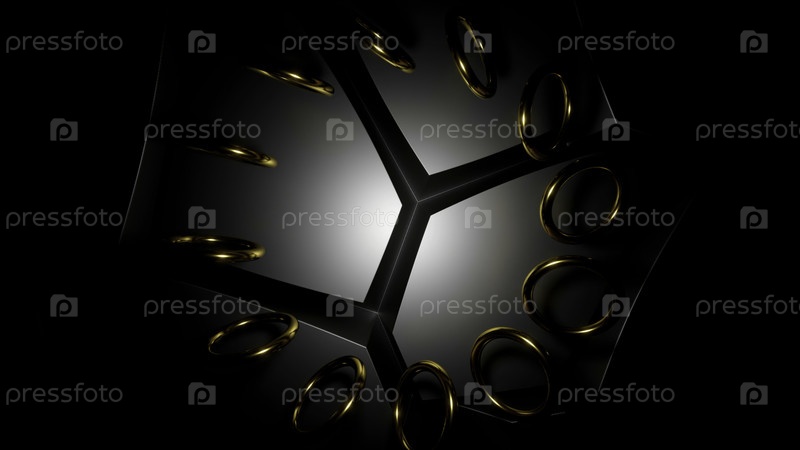 Черный фон с голубыми и золотыми кольцами. дизайн. вращение в круг небольших колец, выполненных в абстракции