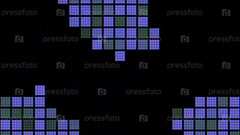 Ретро фон с движущимися квадратами мозаики на черном фоне. Дизайн. Цветные квадраты случайным образом перемещаются на черном фоне. Фон ретро игры со квадратными