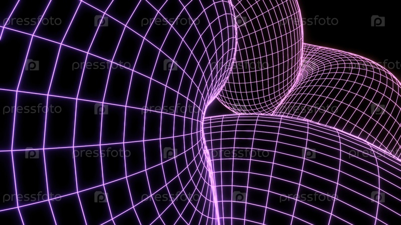 Киберсеть движется в кривых. Дизайн. Кибернетическая сетка в ретро-стиле движется по вихревым формам. Компьютерная киберсеть двигается в трехмерных формах на черном фоне