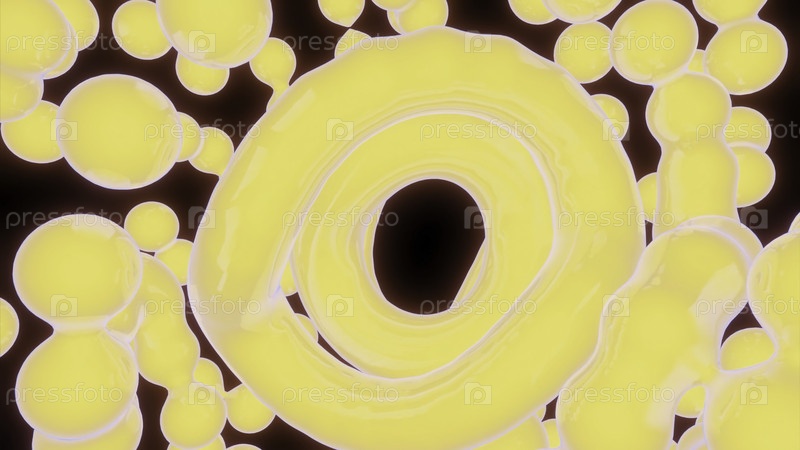 Молекулы жидкости движутся с помощью колец. Дизайн. Жидкие 3D-молекулы объединяются в кольца. 3D-жидкие молекулы двигаются в психоделической анимации