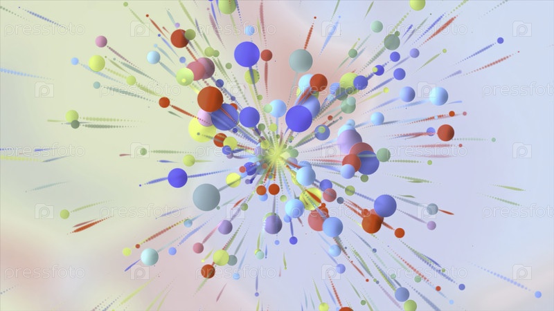 Цветные шары перемещаются к центру.Движение.Абстрактная анимация в биологии или физике с яркими шарами.Цветовые шарики движутся как молекулы и исчезают в центре