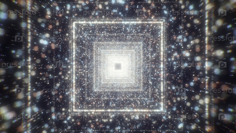 Яркий красочный туннель из светящихся частиц и квадратов.Движение.Красивый космический тоннель с блестящими частицами.Туннель со квадратными линиями и множеством светящихся частиц