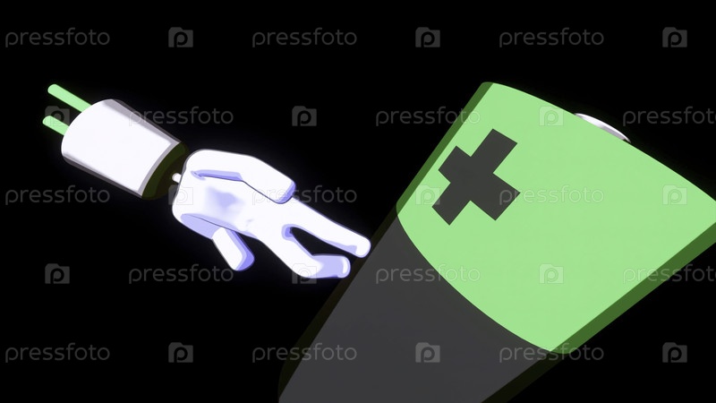 Энергетический абстрактный фон вращающейся батареи. Дизайн. Маленький человек с розеткой вместо головы, ходящий на крутящейся батарее