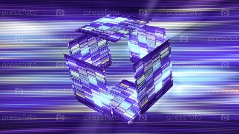 Пустой светящийся куб в киберпространстве.Движение.Футуристический сияющий куб, разлагающийся на части в киберпространстве.Блестящий полосатый куб на фоне красочных линий