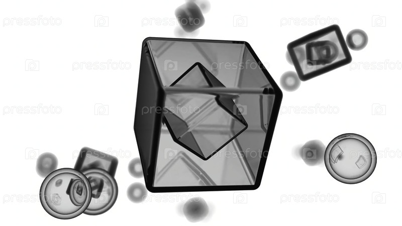 Абстрактные монохромные 3D-кубики и пузыри.Дизайн.Геометрический фон с летающими и вращающимися формами
