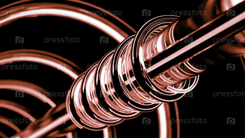 Красная трубка вращается вокруг трубы с радиальными трубами позади.Дизайн.Абстрактный рабочий механизм