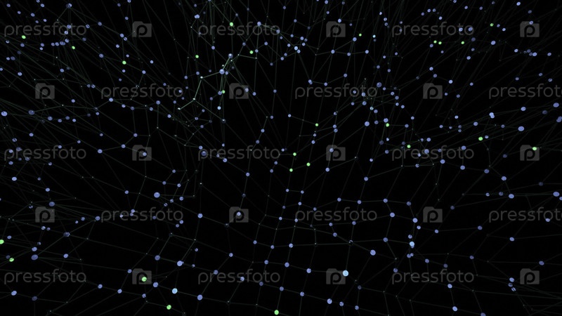 Вибрирующие точки с сеткой на черном фоне. Дизайн. Быстрые флуктуации сетки с точками в пространстве. Виртуальная сетка быстро колеблется