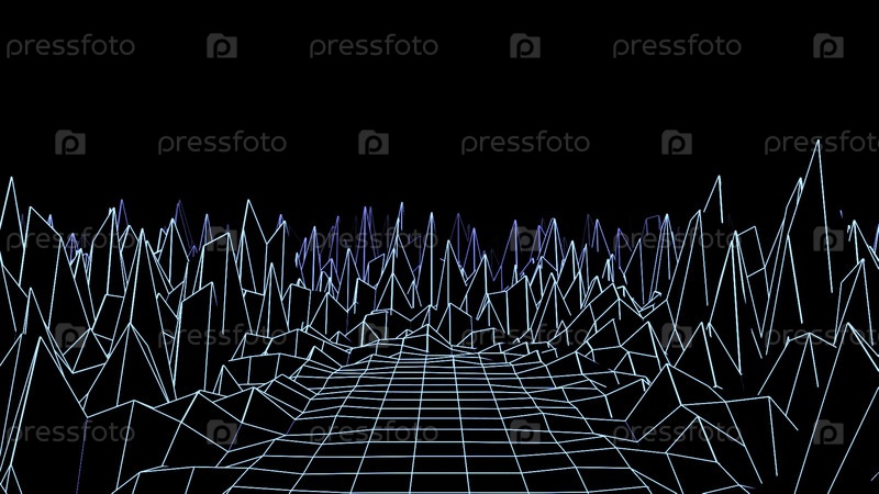Передвигающийся ландшафт ретроволновой волны с движущимися скалами. Анимация. Движение вдоль острых камней и проложенной дороги, сетка на черном фоне