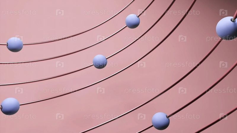 Прокат трехмерных шаров по металлическим линиям. Дизайн. Шары движутся вдоль траектории изгибающихся металлических линий. 3D-конструкция движения шариков вдоль линий