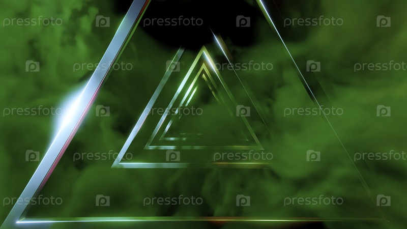 Зеленый и розовый дым возле туннеля треугольника. Дизайн. Золотые треугольники, стоящие на которых яркий спрей многоцветных цветов падает в анимацию. Высокое качество 4k кадры