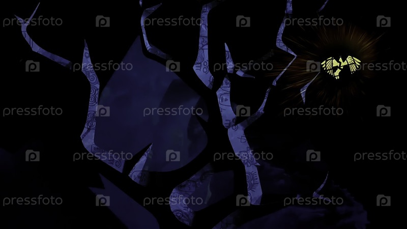 Мультфильм "Таинственный лес и силуэт призрака среди деревьев".Сцена.Золотая птица, запертая в клетке